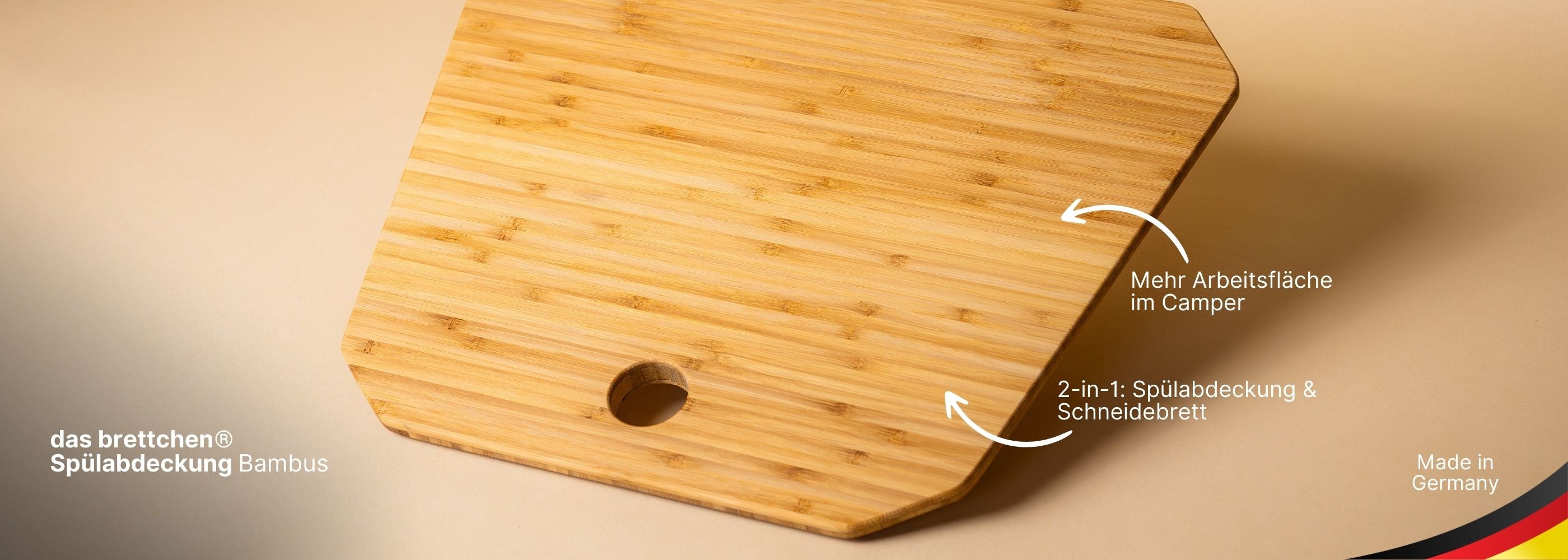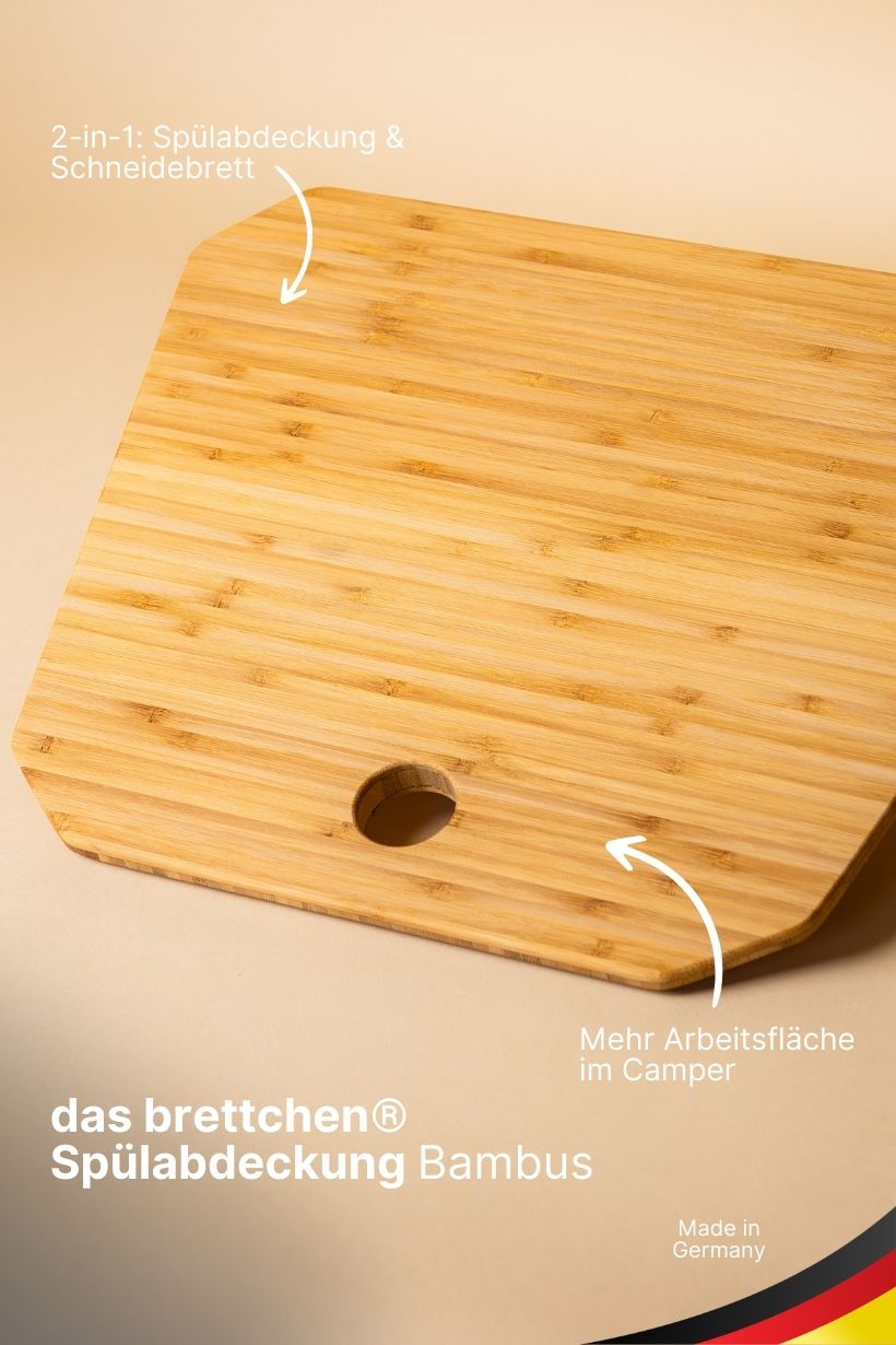 Beim Camping ist platzsparendes Design entscheidend. Unsere exklusive Spülabdeckung aus langlebigem Bambus kann auch als Schneidebrett genutzt werden und bietet dir wertvollen zusätzlichen Arbeits- und Stauraum in deiner mobilen Küche. Mit einer Stärke von 18 mm und einem natürlichen, warmen Bambus-Finish verleiht dieses Board deinem Wohnmobil nicht nur praktische Funktionalität, sondern auch ein elegantes Aussehen.